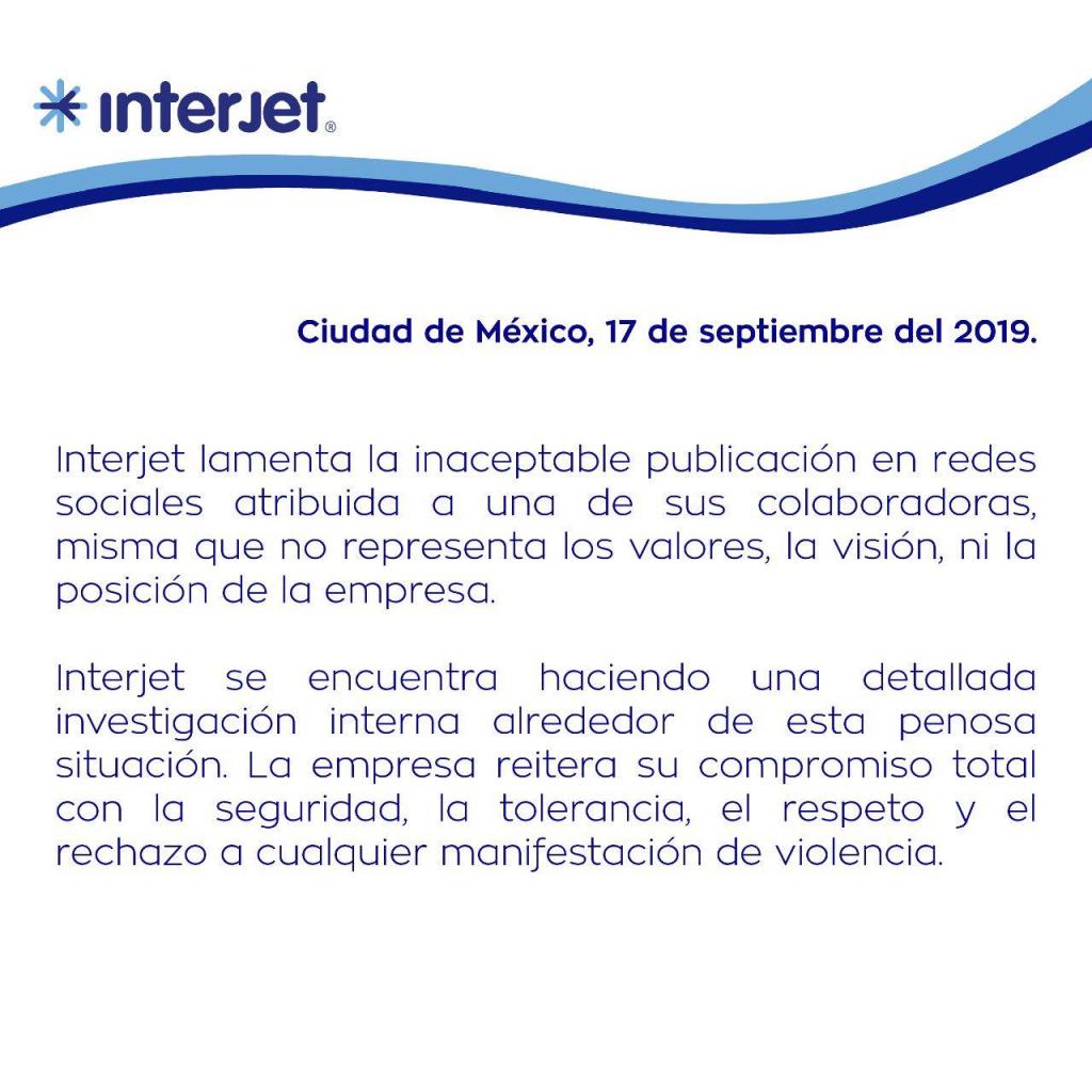 En respuesta a los reclamos, la aerolínea mexicana Interjet difundió un comunicado en su cuenta de Twitter en el que lamenta “la inaceptable publicación” de su piloto, “misma que no representa los valores, la visión ni la posición de la empresa”. La empresa agregó que “se encuentra haciendo una detallada investigación interna alrededor de esta penosa situación”. Y rechazó cualquier manifestación de violencia.